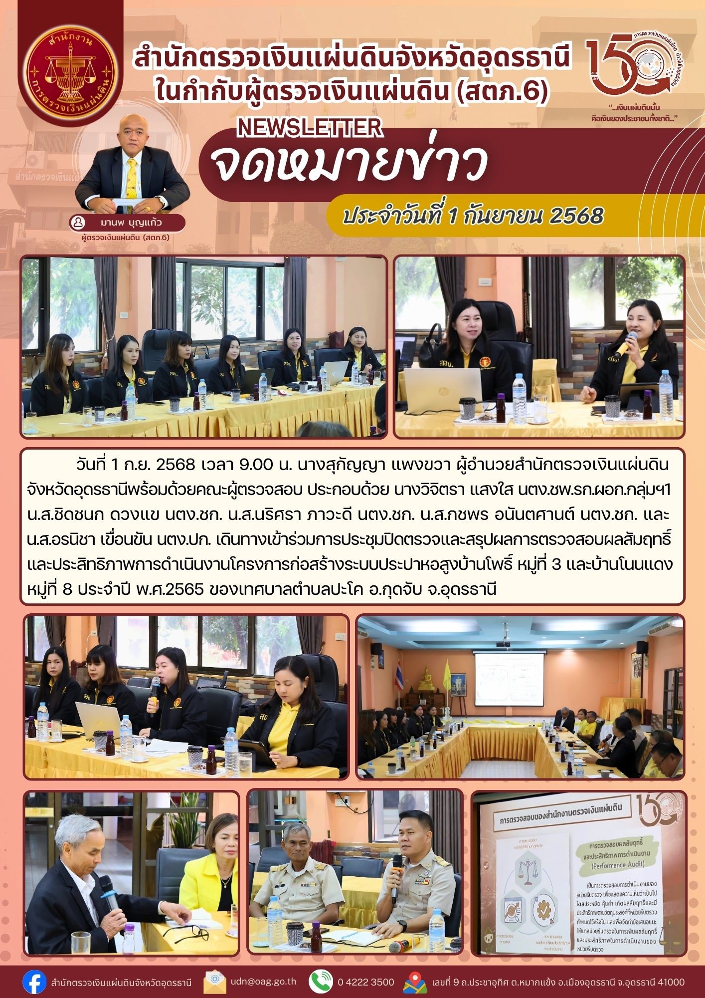 วันที่ 1 ก.ย. 2568 เวลา 9.00 น. นางสุกัญญา แพงขวา ผู้อำนวยสำนักตรวจเงินแผ่นดินจังหวัดอุดรธานี พร้อมด้วยคณะผู้ตรวจสอบ ประกอบด้วย นางวิจิตรา แสงใส นตง.ชพ.รก.ผอก.กลุ่มฯ1 น.ส.ชิดชนก ดวงแข นตง.ชก. น.ส.นริศรา ภาวะดี นตง.ชก. น.ส.กชพร อนันตศานต์ นตง.ชก. และ น.ส.อรนิชา เขื่อนขัน นตง.ปก. เดินทางเข้าร่วมการประชุมปิดตรวจและสรุปผลการตรวจสอบผลสัมฤทธิ์และประสิทธิภาพการดำเนินงานโครงการก่อสร้างระบบประปาหอสูงบ้านโพธิ์ หมู่ที่ 3 และบ้านโนนแดง หมู่ที่ 8 ประจำปี พ.ศ. 2565 ของเทศบาลตำบลปะโค อ.กุดจับ จ.อุดรธานี