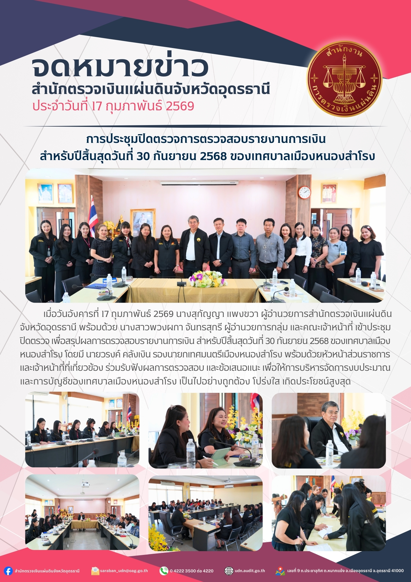 เมื่อวันอังคารที่ 17 กุมภาพันธ์ 2569 นางสุกัญญา แพงขวา ผู้อำนวยการสำนักตรวจเงินแผ่นดินจังหวัดอุดรธานี พร้อมด้วย นางสาวพวงผกา จันทรสุกรี ผู้อำนวยการกลุ่ม และคณะเจ้าหน้าที่ เข้าประชุมปิดตรวจ เพื่อสรุปผลการตรวจสอบรายงานการเงิน สำหรับปีสิ้นสุดวันที่ 30 กันยายน 2568 ของเทศบาลเมืองหนองสำโรง โดยมี นายวรงค์ คลังเงิน รองนายกเทศมนตรีเมืองหนองสำโรง พร้อมด้วยหัวหน้าส่วนราชการ และเจ้าหน้าที่ที่เกี่ยวข้อง ร่วมรับฟังผลการตรวจสอบ และข้อเสนอแนะ เพื่อให้การบริหารจัดการงบประมาณ และการบัญชีของเทศบาลเมืองหนองสำโรง เป็นไปอย่างถูกต้อง โปร่งใส เกิดประโยชน์สูงสุด