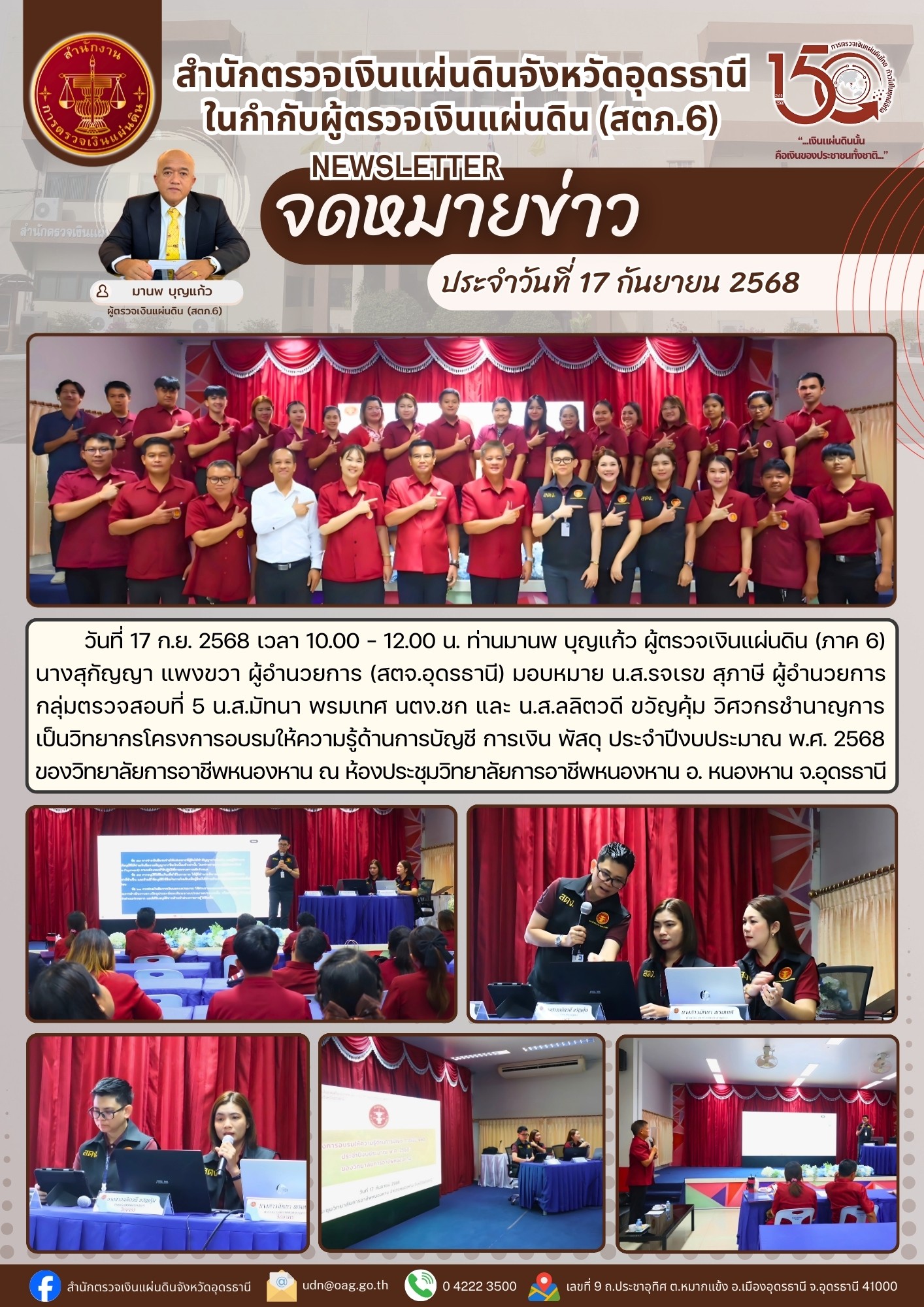วันที่ 17 ก.ย. 2568 เวลา 10.00 – 12.00 น. ท่านมานพ บุญแก้ว ผู้ตรวจเงินแผ่นดิน (ภาค 6) นางสุกัญญา แพงขวา ผู้อำนวยการ (สตจ.อุดรธานี) มอบหมาย น.ส.รจเรข สุภาษี ผู้อำนวยการกลุ่มตรวจสอบที่ 5 น.ส.มัทนา พรมเทศ นตง.ชก และ น.ส.ลลิตวดี ขวัญคุ้ม วิศวกรชำนาญการ เป็นวิทยากร “โครงการอบรมให้ความรู้ด้านการบัญชี การเงิน พัสดุ ประจำปีงบประมาณ พ.ศ. 2568” ของวิทยาลัยการอาชีพหนองหาน ณ ห้องประชุมวิทยาลัยการอาชีพหนองหาน อ. หนองหาน จ.อุดรธานี