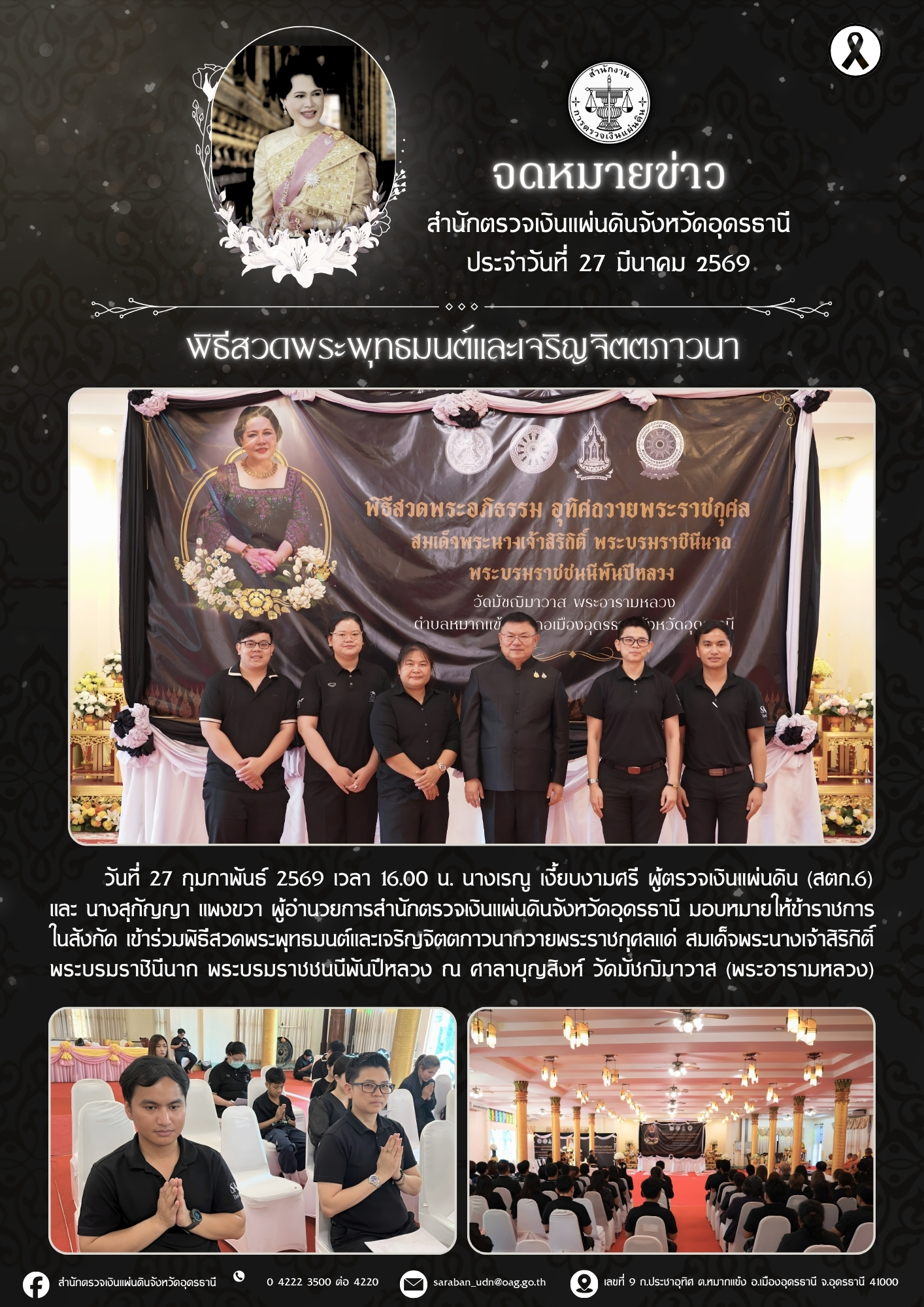 วันที่ 27 กุมภาพันธ์ 2569 เวลา 16.00 น. นางเรณู เงี้ยบงามศรี ผู้ตรวจเงินแผ่นดิน (สตภ.6) และ นางสุกัญญา แพงขวา ผู้อำนวยการสำนักตรวจเงินแผ่นดินจังหวัดอุดรธานี มอบหมายให้ข้าราชการในสังกัด เข้าร่วมพิธีสวดพระพุทธมนต์และเจริญจิตตภาวนาถวายพระราชกุศลแด่ สมเด็จพระนางเจ้าสิริกิติ์ พระบรมราชินีนาถ พระบรมราชชนนีพันปีหลวง ณ ศาลาบุญสิงห์ วัดมัชฌิมาวาส (พระอารามหลวง)